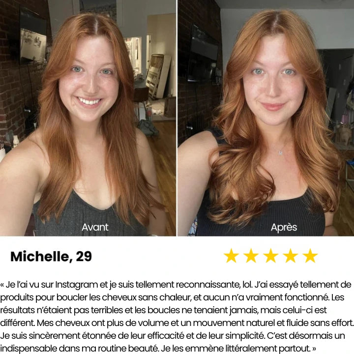 « C'est une véritable révolution ! J'adore pouvoir les mettre en place en quelques minutes avant de me coucher et me réveiller avec des boucles dignes d'un salon de coiffure. Mes cheveux sont plus sains et je n'ai plus besoin de passer du temps le matin à me battre avec des appareils chauffants. Ça me fait gagner tellement de temps ! » « C'est une véritable révolution ! J'adore pouvoir les mettre en place en quelques minutes avant de me coucher et... « C'est une véritable révolution ! J'adore pouvoir les mettre en place en quelques minutes avant de me coucher et me réveiller avec des boucles dignes d'un salon de coiffure. Mes cheveux sont plus sains et je n'ai plus besoin de passer du temps le matin à me battre avec des appareils chauffants. Ça me fait gagner tellement de temps ! »